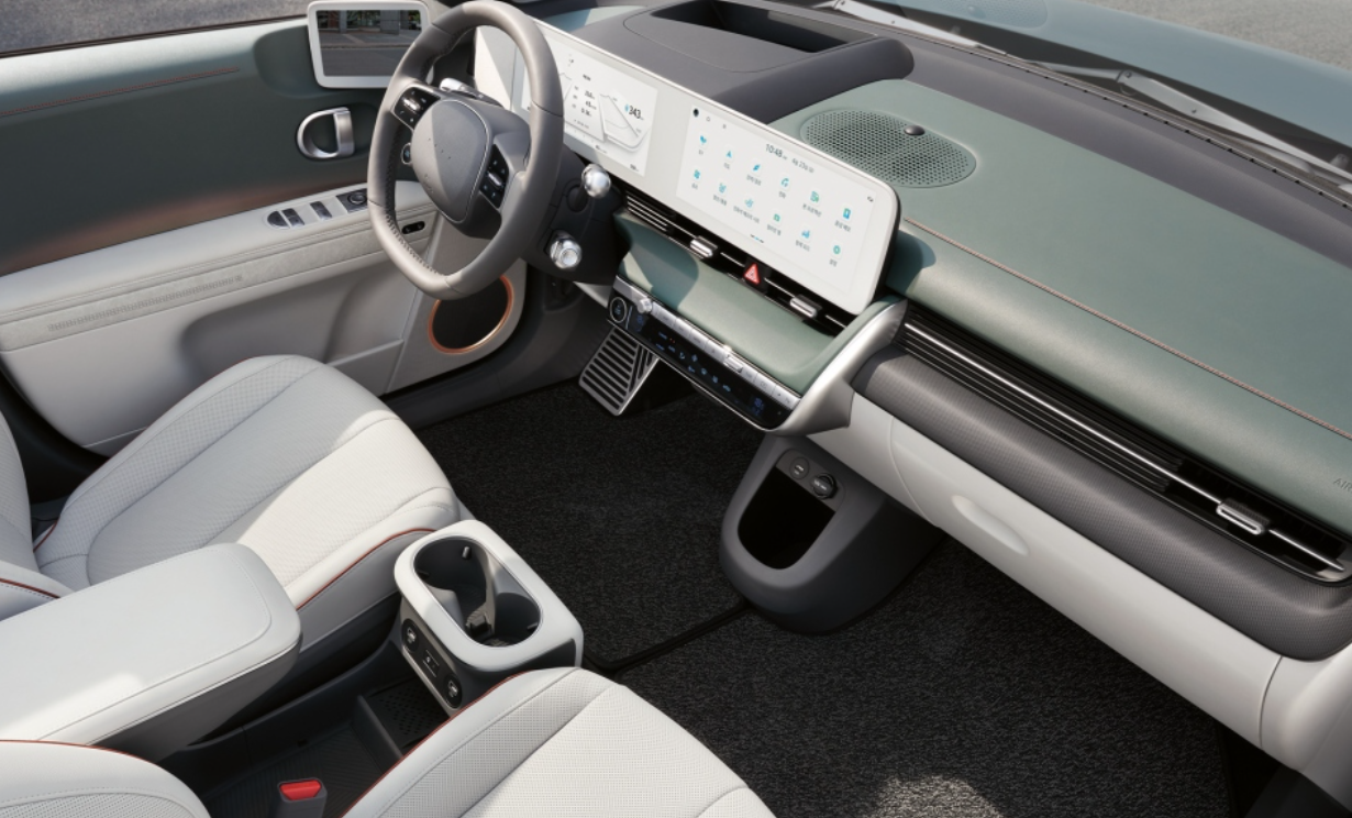 현대차직원분이 앞에 아이오닉5가 주차되어 있다고 차를 보여주셨는데 그린펄 색상이였어요 세련되어 보이고 좋았지만 저는 아무래도 그레이색상이 많이 끌렸던 거 같습니다. 내부를 한번 봤는데 실내공간이 정말 넓고 깔끔했습니다. 가죽냄새인지는 모르겠지만 휴지냄새인지 모르겠지만 이상한 냄새가 났었습니다.